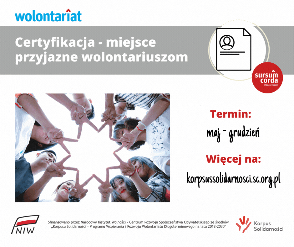 Dowiedz się więcej o procesie certyfikacji organizatorów wolontariatu w Korpusie Solidarności oraz jak uzyskać certyfikat „Miejsce Przyjazne Wolontariuszom”.